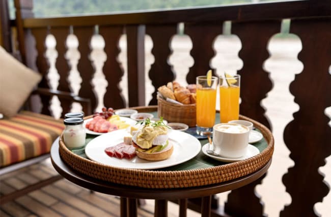 From the dining hall, walk up the classic wooden staircase to find the glass-encased Café-bar & Lounge, offering a laid-back experience in air-conditioned comfort with elegantly designed sofas, cushioned rattan chairs, and massive windows allowing fabulous views of the dramatic scenery. Shaded sunbeds line the Terrace Deck, and it’s here that cultural shows take place, such as the traditional Baci ceremony for good blessings.