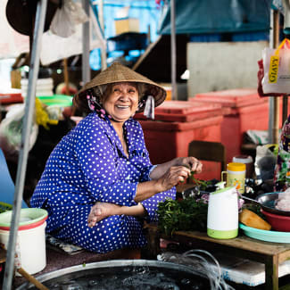 AM: Travel by skiff along Bassac Canal to Chau Doc floating market then head off by van to Long Son Pagoda atop Sam Mountain. Ask the monks about their age-old Buddhist practices. Return via the bustling morning market. Optional 18 kilometers bike ride on Long Khanh Island or take a rickshaw ride to visit Tan Chau Market with chef.
