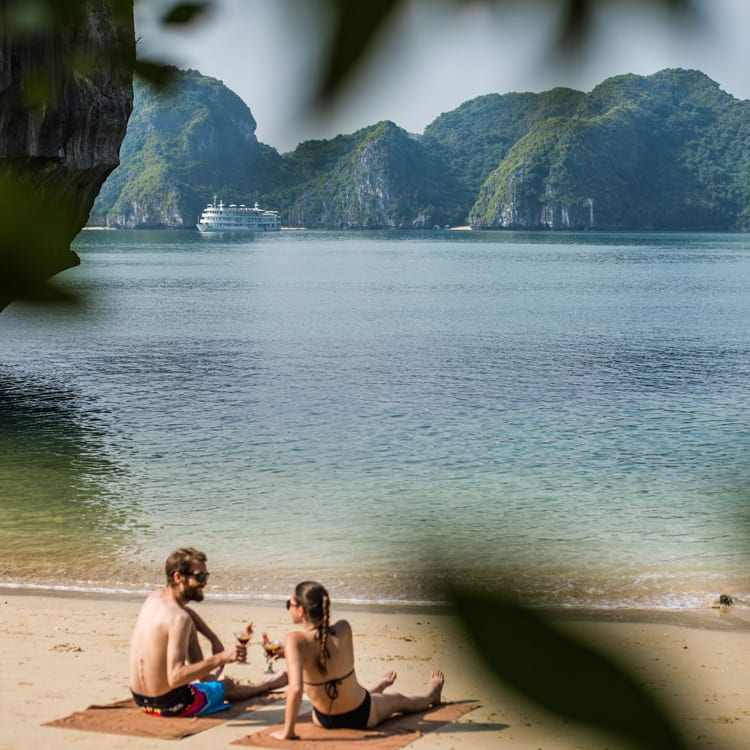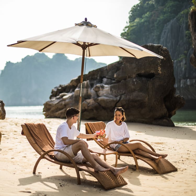 The onboard dining room serves fusion style cuisine: international, seafood, Asian and classic Vietnamese. Meals are served buffet style, or from an a la carte menu or a set menu. Special dietary requirements are catered for and you are welcome to personalize your food and drink menus. Your meal arrangements can include a mobile dining set-up, served by your private butler, which you can enjoy on the sundeck, on a pristine beach or in one of the bay’s many caves.