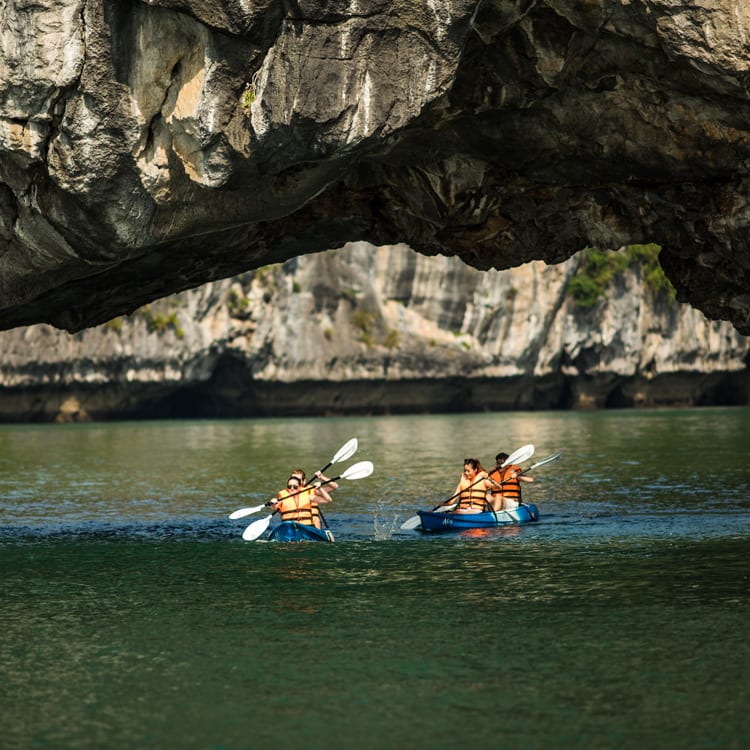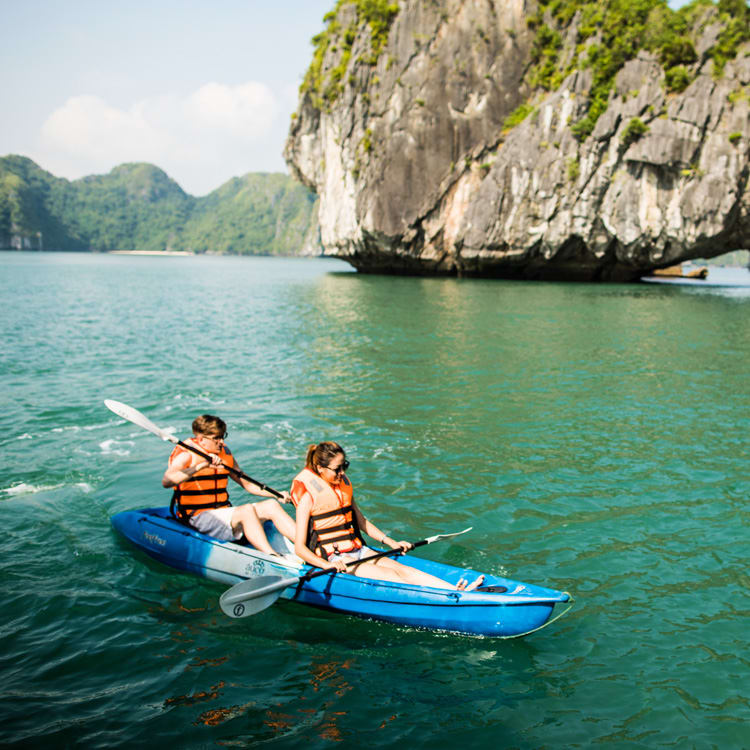 Shore and water activities include kayaking and swimming, visits to floating villages, cooking demonstrations, squid fishing, visits to caves and a pearl farm. You can kayak through caves into stunning bays, take a guided kayaking tour in a karst tunnel, visit Cat Ba Island, tour the island by bicycle and meet villagers. Trek to a sightseeing point or cycle through the rainforest. Explore Sung Sot Cave, the largest cave inside Halong Bay with 12,000 square yards of space home to thousands of stalactites and stalagmites.