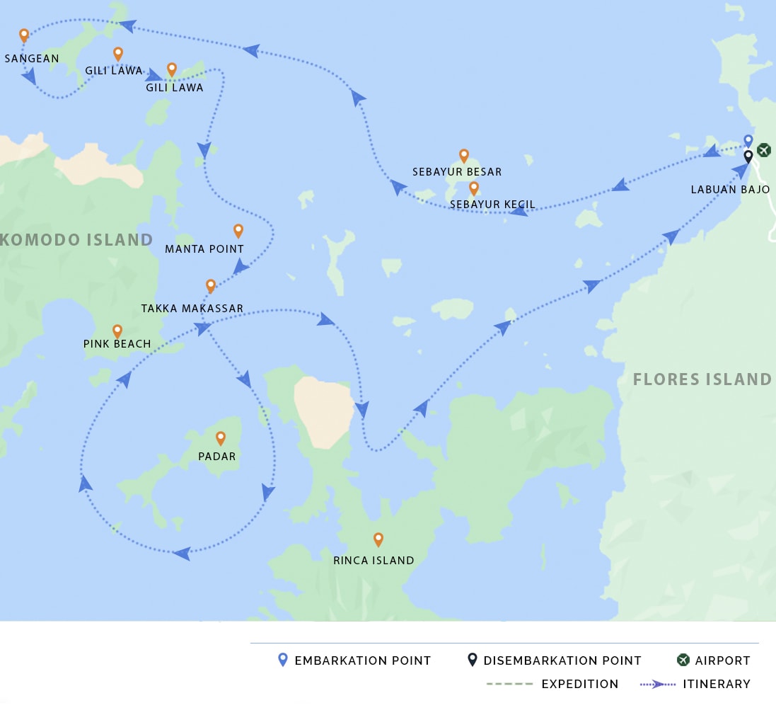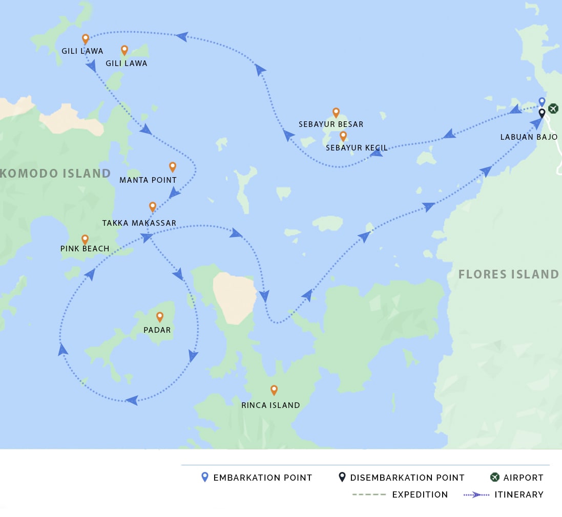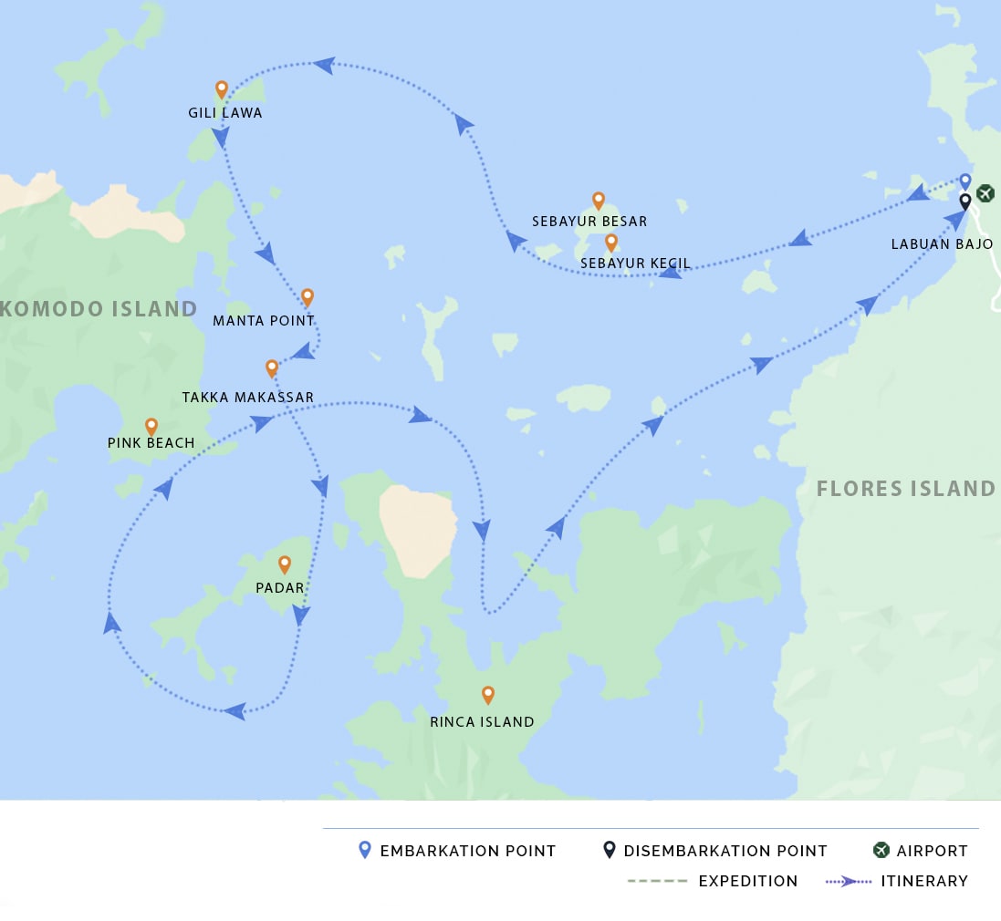 AM: Welcome onboard Celestia. We depart Labuan Bajo to Sebayur Besar and Sebayur Kecil. The remainder of the day is reserved for diving or snorkeling the sights surrounding the islands, beach time, and trekking - if the tide allows.