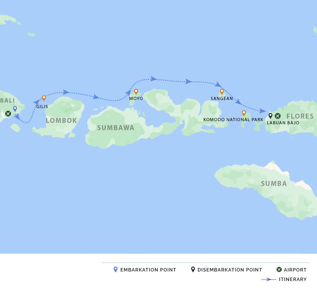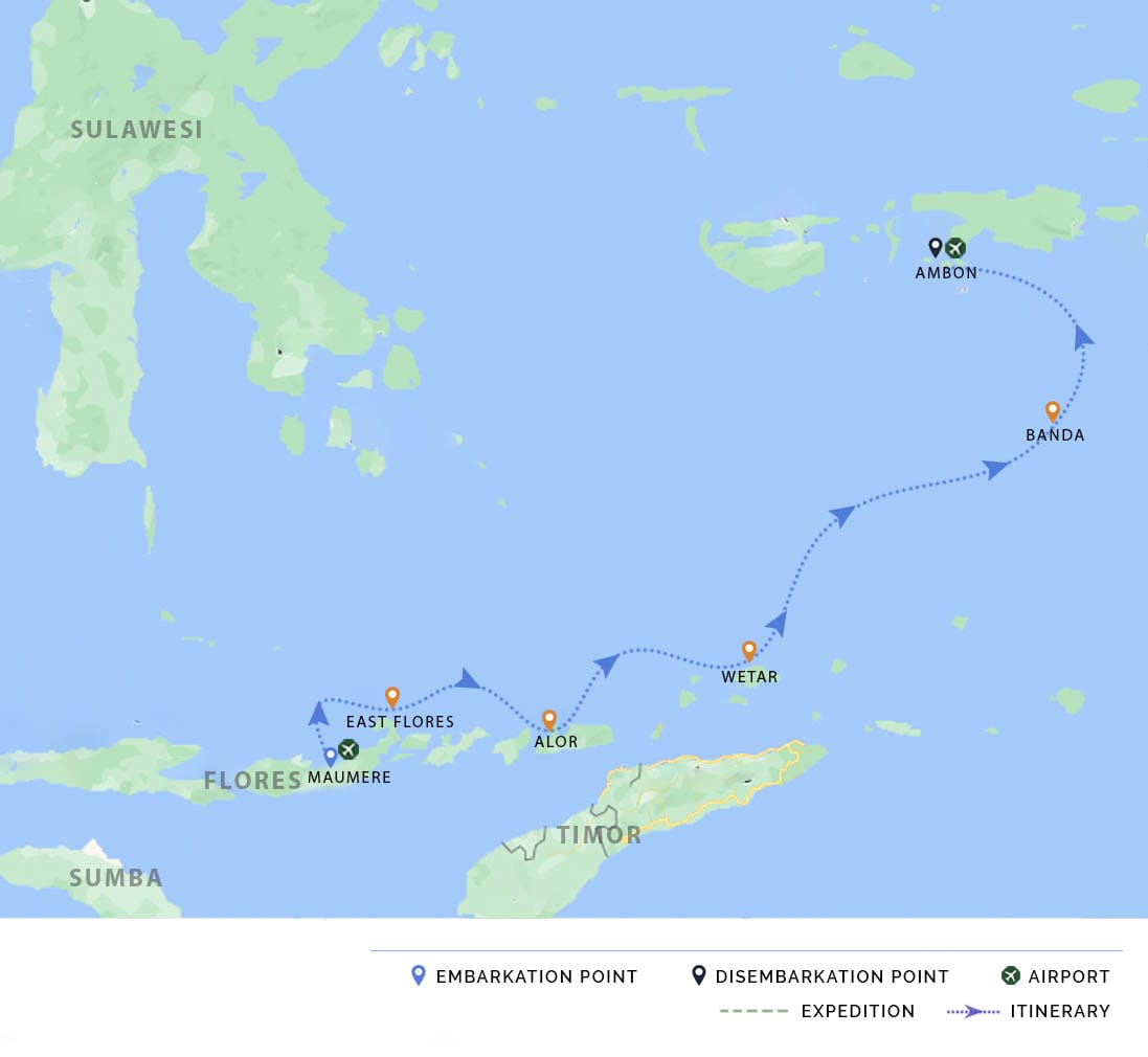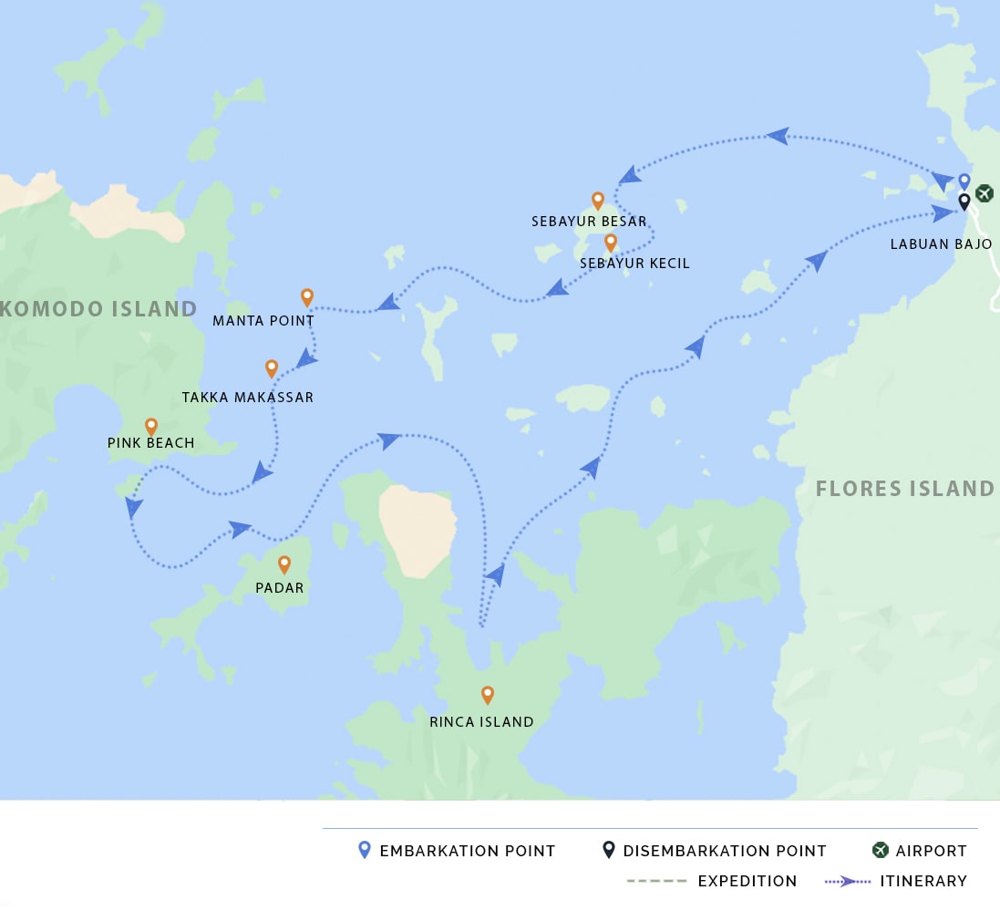 AM: Welcome onboard Celestia. We depart Labuan Bajo to Sebayur Besar and Sebayur Kecil. The remainder of the day is reserved for diving or snorkeling the sights surrounding the islands, beach time, and trekking - if the tide allows.