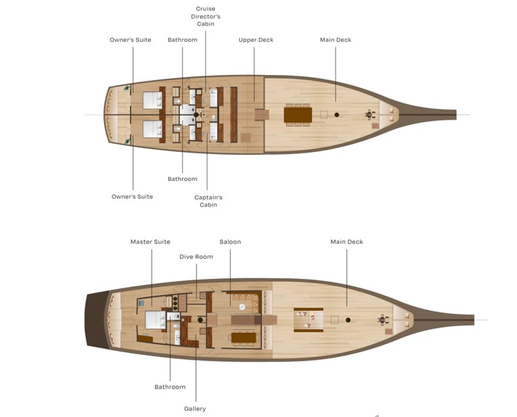 Our lower deck has 4 Deluxe Suites including 2 queen-bed suites and 2 twin-bed suites. Each of our suites has been carefully designed with luxury amenities and a refined sense of space for each guest. Similarly equipped with porthole windows, a private bathroom, air-conditioning, and ample storage space.