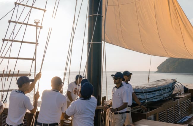 An elegant phinisi yacht offering exclusive Coral Triangle exploration with water sports included.