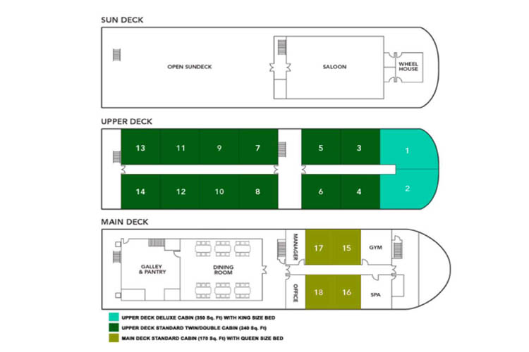 The main deck cabins, featuring queen size beds, offer comfort without any additional charge. Reflecting the essence of Assam, the decor combines colonial elegance with traditional Assamese designs on hand-woven cotton fabrics, creating a warm and inviting ambiance. These cabins also include French balconies, providing guests with a charming space to admire the scenery and soak in the atmosphere of the journey.