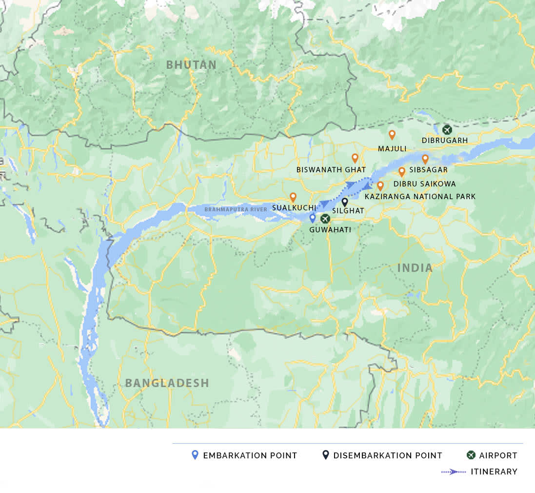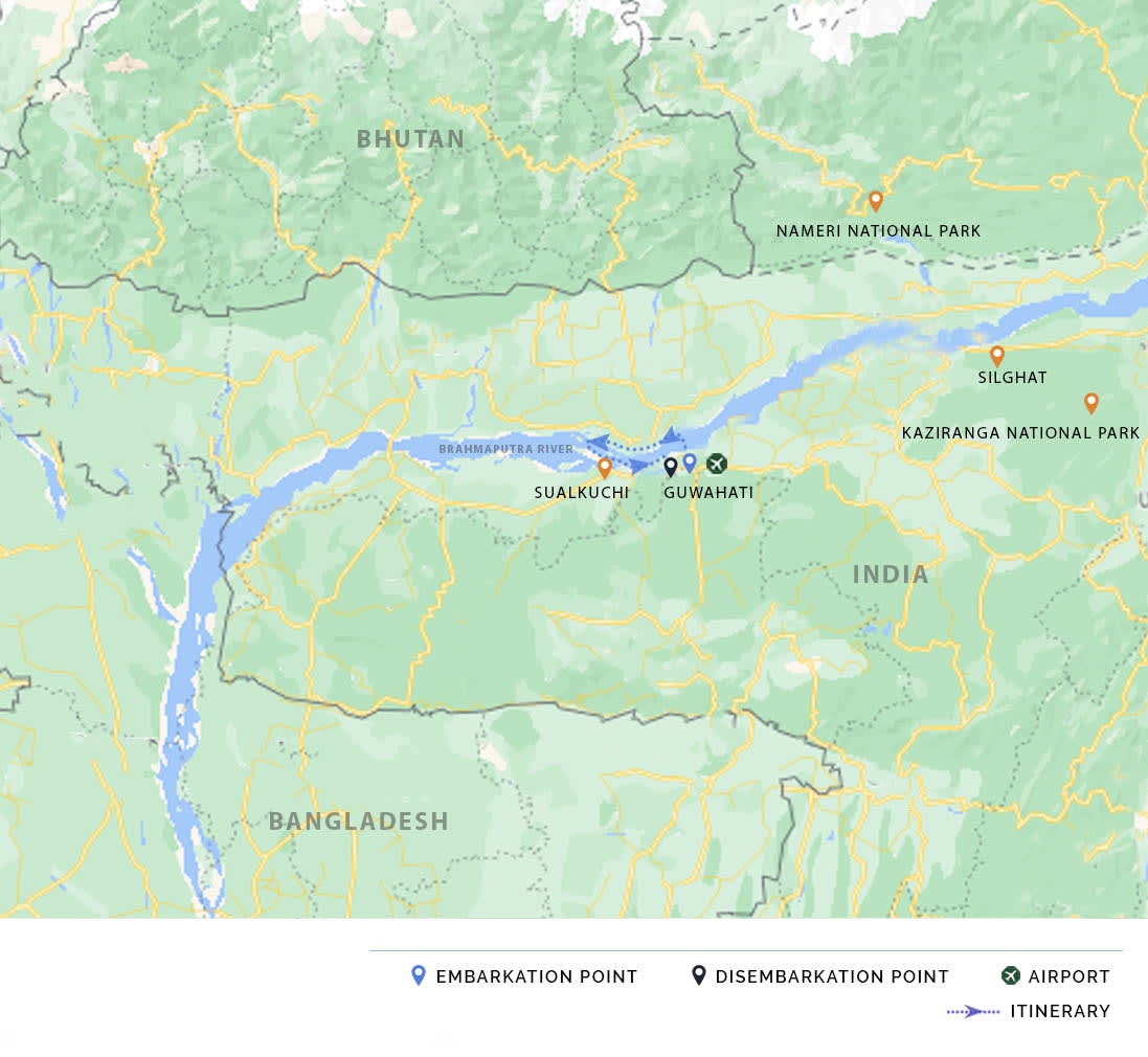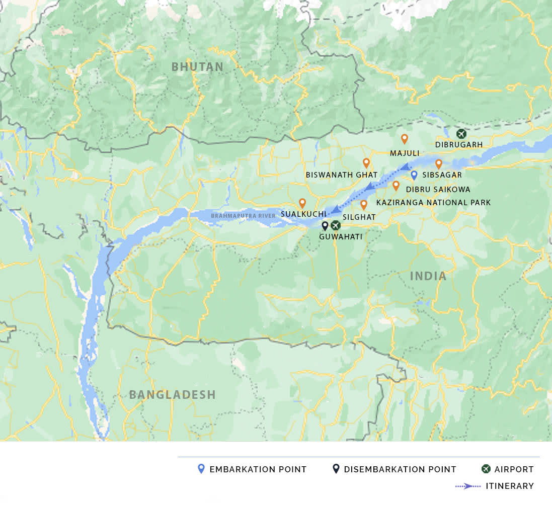 Note: Kaziranga National Park has low-lying grassland, which may not be accessible when the river is at or near flood level. This itinerary, including the cruise and approximate driving durations, is subject to river and weather conditions.