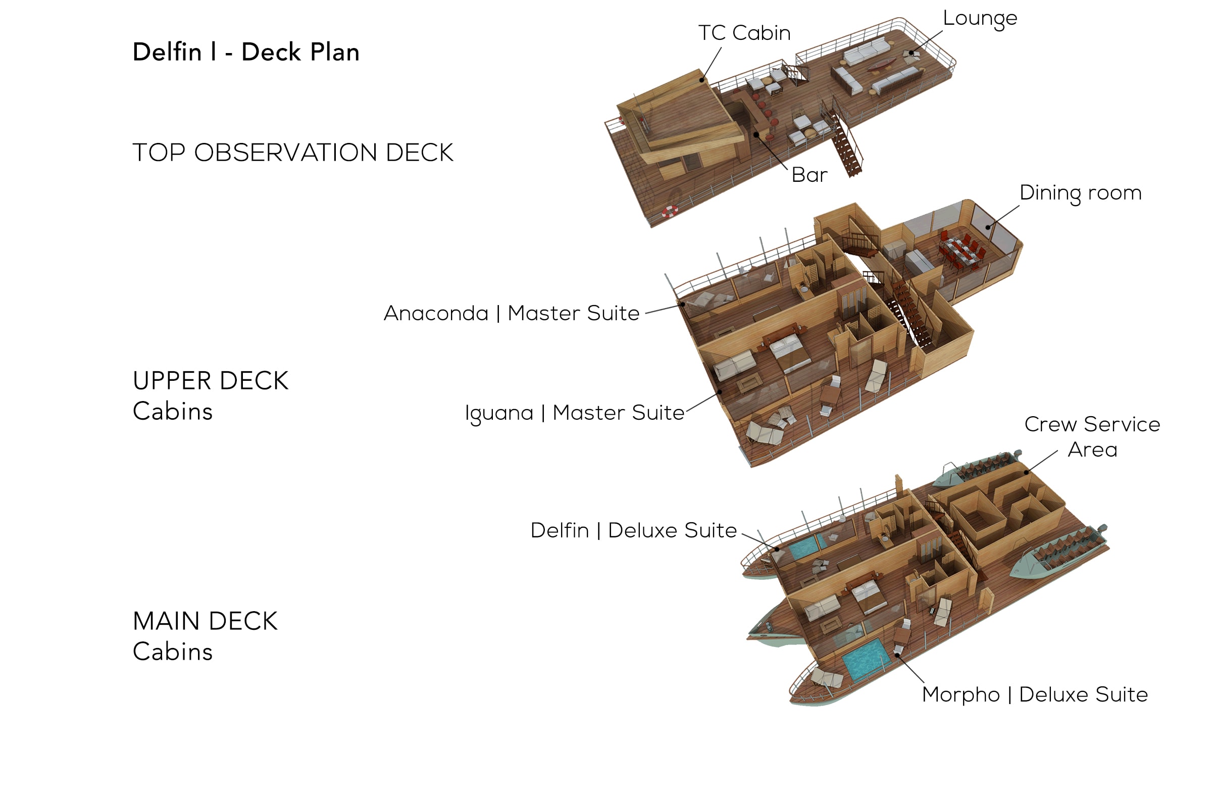 Enormous cabins with private balcony, floor to ceiling panoramic windows and all the mod-cons of a 5 star hotel, including a minibar, blackout windows internal communication, enjoy utter privacy on your Amazon terrace, measuring 30 m² / 320 ft². Triple occupancy is possible using the futon. Master Suites are located on the Upper Deck.
