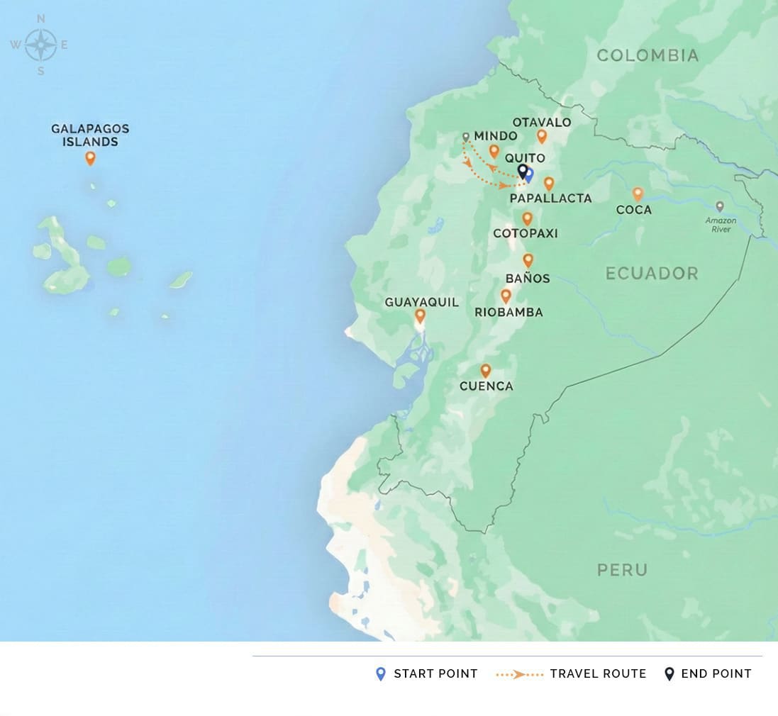 Once in Quito, you’ll delve into history as you explore the famous colonial center of this enthralling city. Adventure continues with an exciting charter helicopter ride for an overhead view of the city and amazing sites surrounding it, including mountains, volcanoes, forests, waterfalls, and parks.