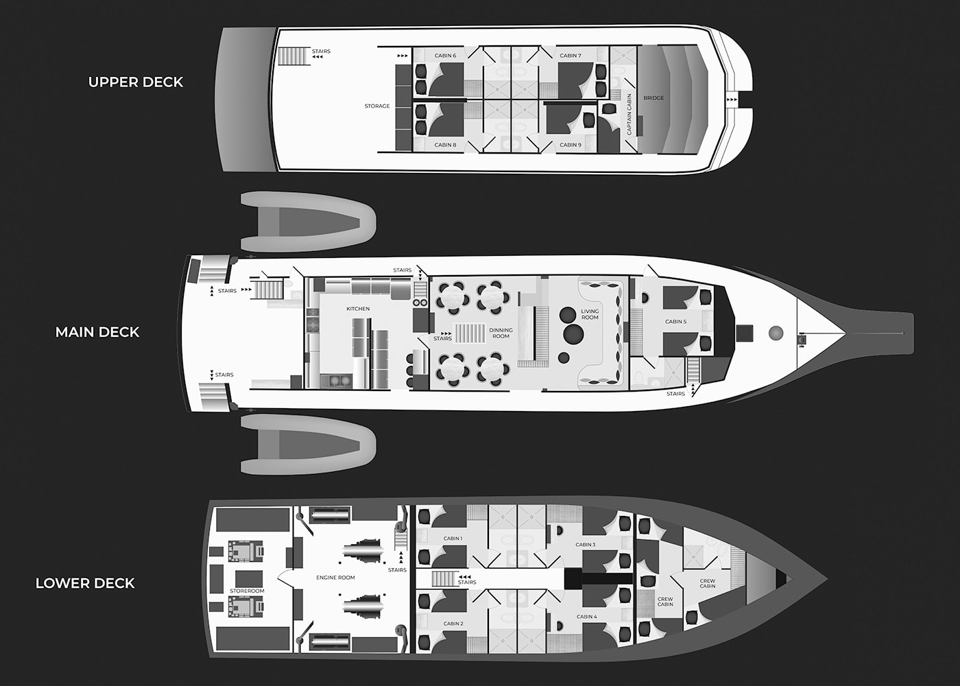 The 8 cabins are split over 3 decks, 3 matrimonial on the Upper Deck, 1 twin (convertible to double) on the main deck, and 4 twin on the lower deck (two of which can be converted to doubles). All cabins feature local decoration, functional closets, air conditioning with personal control, reading light and charging ports.