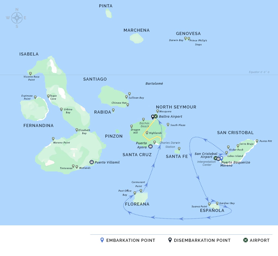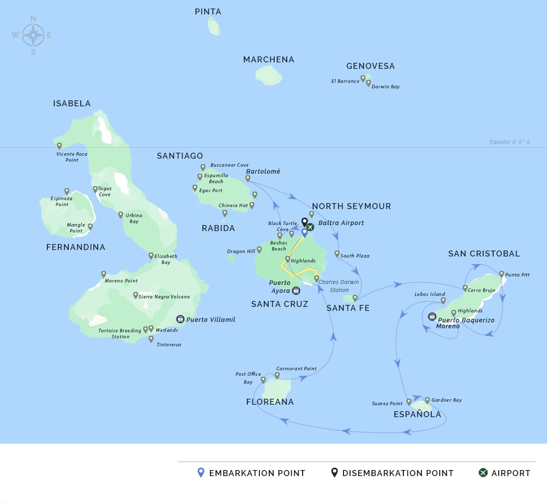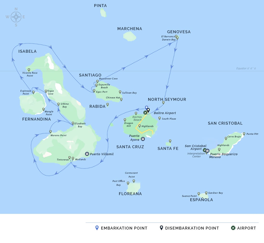 AM: Your voyage to the captivating Galapagos Islands commences! Upon your arrival at Baltra Airport, you'll be greeted by our National Park-certified naturalist guide, ready to introduce you to the unique wonders of this pristine archipelago.