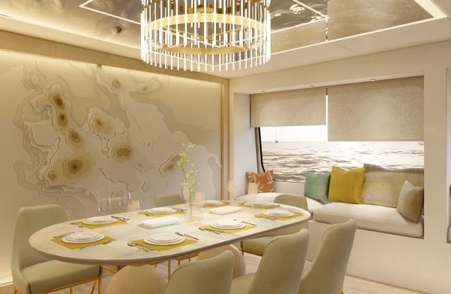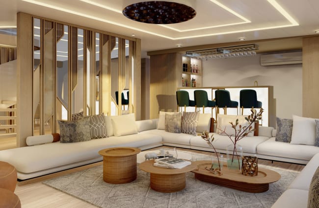 The principal deck has four cabins with balconies, an additional cabin without a balcony to the bow, the dining room, a coffee station, the living room, and the bar, plus some cozy outdoor seating to the rear. The upper deck features the bridge, behind which are four more cabins with balconies, and an alfresco area to the rear. Above it, the sun deck is the perfect location to relax and unwind with its wide solarium, Jacuzzi, and lazy chairs.