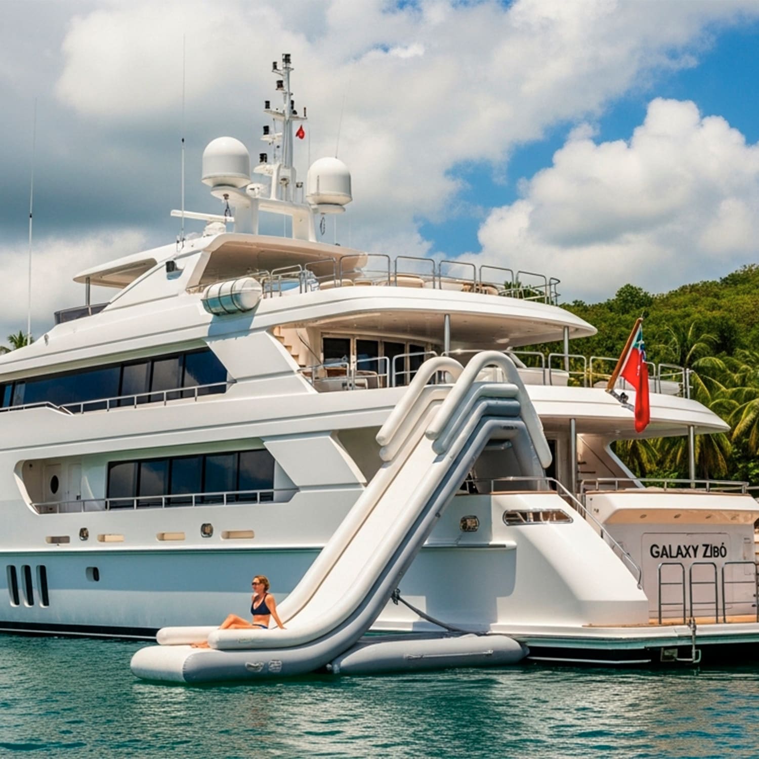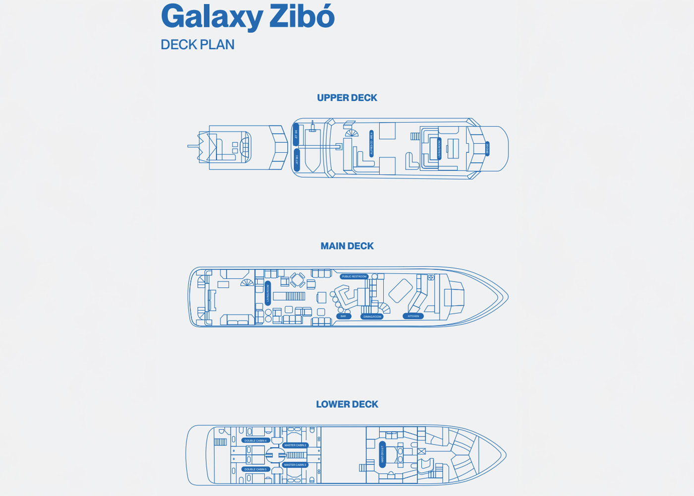 The main deck brings guests together—lounge, dining room, bar, and galley in an open, sunlit space with sliding doors and constant sea breeze, while the Galaxy Zibó’s lower deck gives direct access to the water. With a wide swim platform, gear storage, and open steps, it’s your launch point for every activity. Her upper deck offers loungers, shaded seating, bar access, and the water slide platform—an open-air space built for sun, views, and relaxed afternoons.