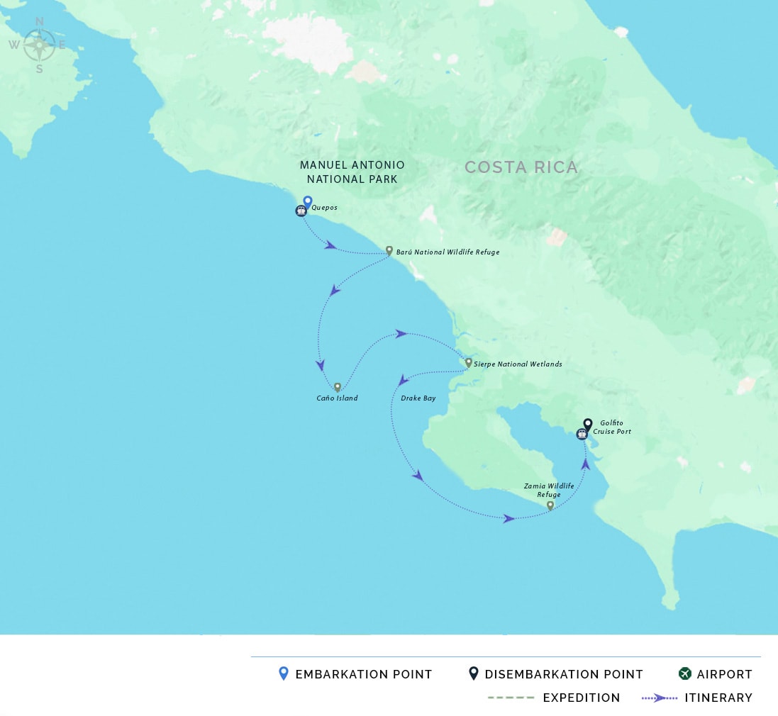 AM: The day begins as we arrive in Drake Bay, a secluded cove in the northern Osa Peninsula embraced by untouched jungle and hidden beaches. Named after the legendary corsair Sir Francis Drake, this region still holds an air of mystery and is replete with opportunities for exploration. After breakfast onboard, the adventure continues upriver into the Sierpe Wetlands. This area is one of Central America’s most extensive mangrove systems. Aboard the ship’s smaller boats, we navigate through green labyrinths where aerial mangrove roots shelter wildlife such as caimans, white-faced capuchin monkeys, and vibrant roseate spoonbills. It is an experience that feels like gliding into a living, breathing jungle.