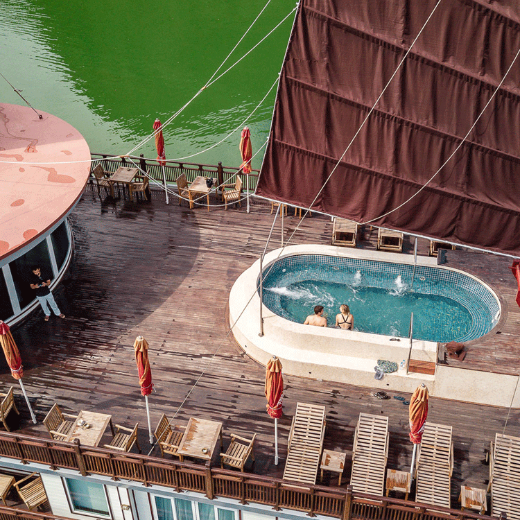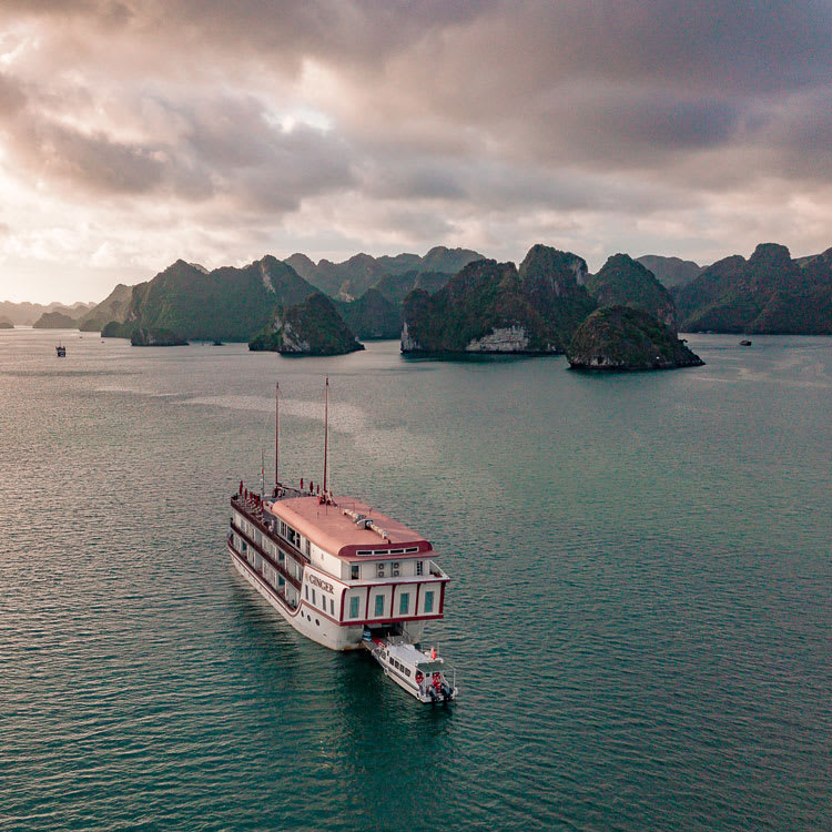 Built in the style of a traditional Indochine-Vietnamese junk boat with contemporary and classic art themes and sumptuous interiors, the dazzling 187-ft Ginger is both incredibly spacious and timelessly elegant. She accommodates just 24 guests, and cruises the quiet Lan Ha Bay area of the Halong Bay archipelago in Northern Vietnam.