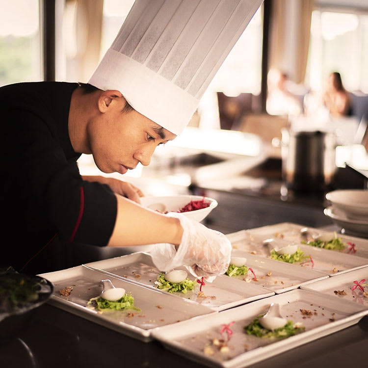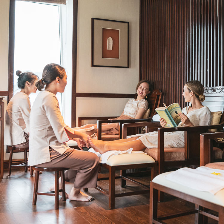 The Signature Suites are perfect for honeymooners, each with a mosaic-tiled bathroom and delicate floral embroidery on the silk wall hangings creating a romantic and dreamy atmosphere. The two Regent Suites, named White Crane and Blue Phoenix, both present a vast amount of space, antique furniture, gold leaf accents and a jacuzzi, in which you can bubble all your troubles away while enjoying unparalleled vistas over the Bay.