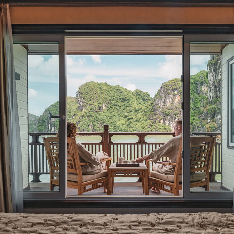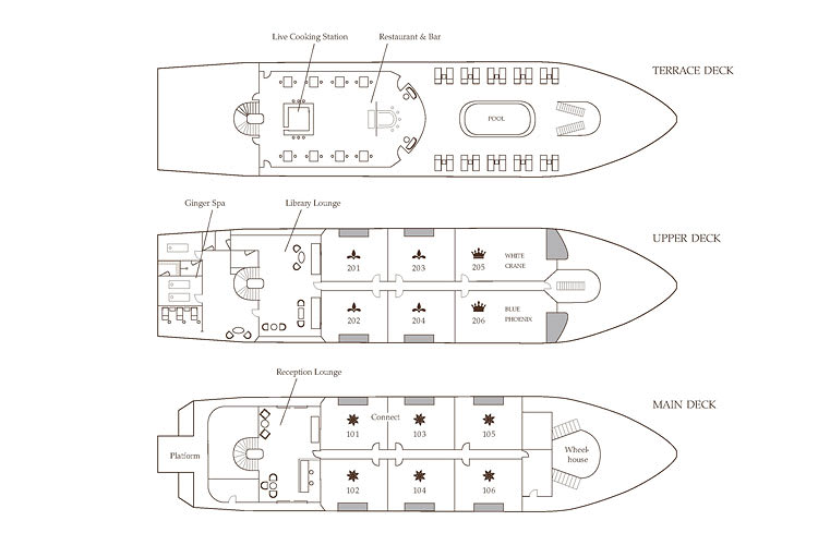 Ginger has 12 large suites, divided into three categories and split over two decks. Each has full-length glass windows, a comfortable seating area, unique handmade decorations and furnishings, an en-suite bathroom, and a generously-sized private balcony overlooking the mesmerizing Lan Ha Bay. The Junior Suites, located on the Lower Deck feature a light and airy contemporary design, hand-inked with images of local scenery and silver leaf details on the ceilings; two of these suites interconnect, making them ideal for a family.