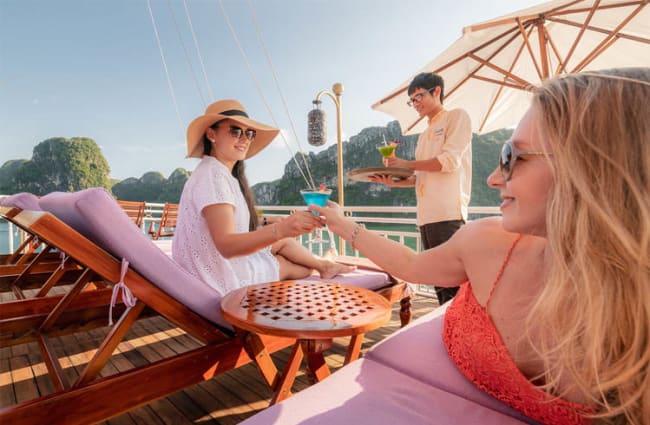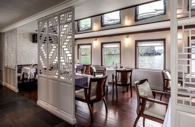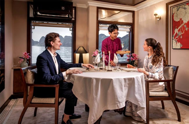 Multi course meals ‒ including a wide variety of dishes created from the finest local and internationally sourced ingredients ‒ are served in the dining room, on the sun deck, in your suite or on your balcony. The menu includes delicious seafood caught that very day, and delectable Vietnamese fusion cuisine, as well as other Asian delights and international dishes. All meals are served à la carte with breakfast accompanied by a side buffet offering many more options.