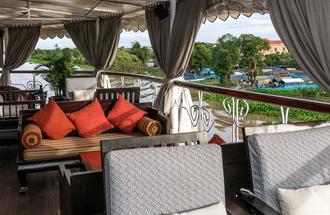 From the moment you step aboard, you will be made to feel at home and wherever you look, you will be reminded of the local arts and culture. Be wowed by the antique artifacts and local artwork in the rose-walled Henri Mouhot Lounge, named after the French archaeologist who discovered the Angkor temple complex. Here, dark furniture and harmonious Asian fabrics provide the perfect setting in which to relax or read a book among the Jayavarman’s Khymer treasures.