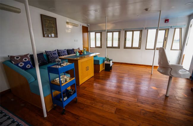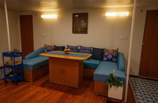 MV Bhitarkanika boasts just two spacious suites designed to host up to four guests in supreme comfort, ensuring a restful night’s sleep in the heart of the forest. Contemporary furnishings, original artworks on palm leaves, handloom textiles, and luxury linens create a tranquil haven. From honeycomb spa robes and slippers to spa-quality bath amenities, every detail is designed for indulgence.