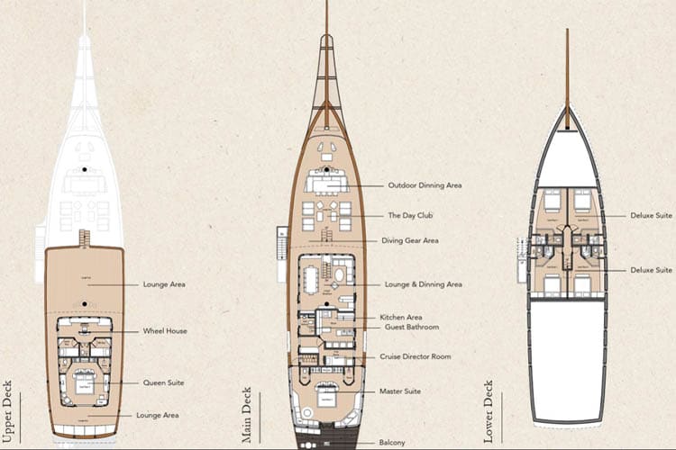Accommodation aboard is generous and elegant, with spacious suites featuring ensuite bathrooms, refined furnishings, and large windows that frame ever-changing ocean views. The yacht’s social areas are equally impressive, including indoor lounges, open-air dining spaces, and expansive deck areas designed for relaxation and connection with the surroundings.