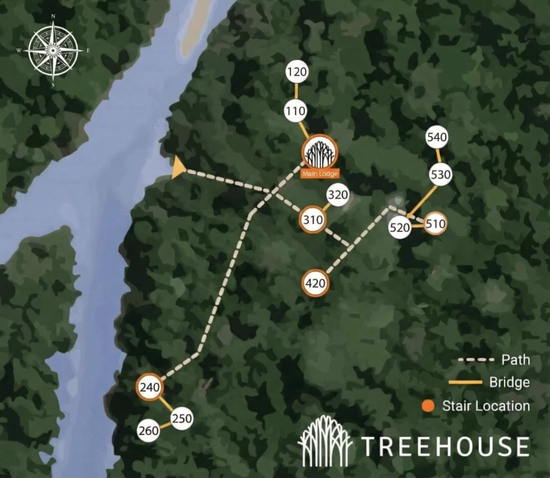 Directions: Walk 80 feet from the main lodge along the raised wooden pathway, walk 15 feet up arching stairs, cross steel cable bridge.