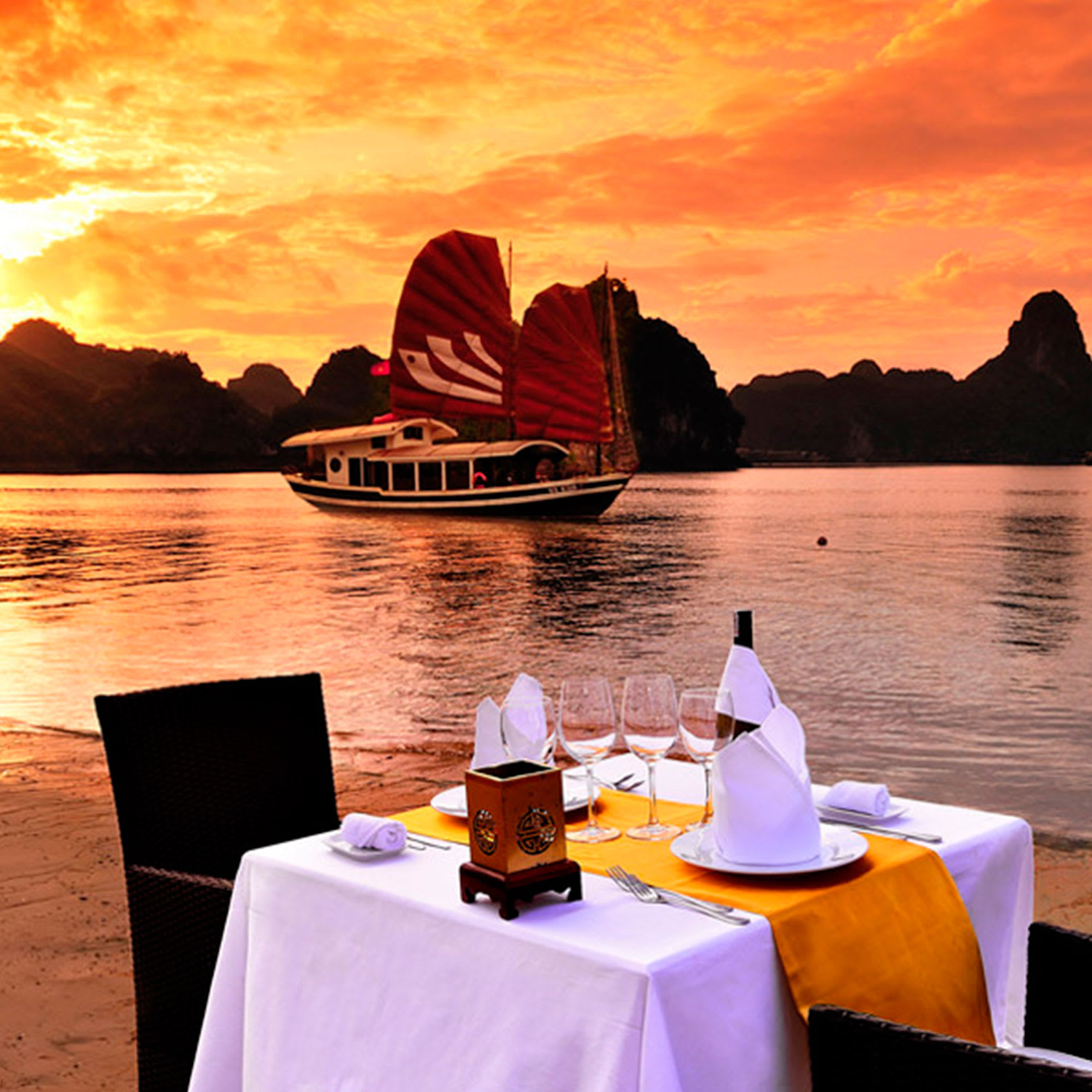 The onboard dining room serves fusion style cuisine: international, seafood, Asian and classic Vietnamese. Meals are served buffet style, or from an a la carte menu or a set menu. Kids’ meals and special dietary requirements are catered for, and you are welcome to personalize your food and drink menus. If you wish, you can relish an al fresco dinner on your own secluded beach.