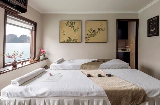 Facilities on board the Halong Violet Cruise are extensive for a boat of this size. There is a small spa with one room for singles and one room for couples, offering a selection of relaxing treatments including east-west massages, reflexology, and pedicures and manicures administered by skilled therapists. Violet also has her own gym and a sauna, the latter with room for two guests.