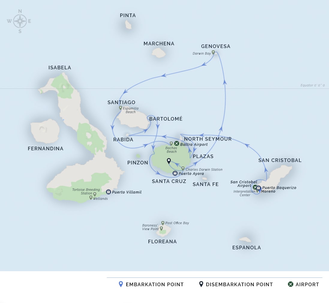 AM: You will arrive at Baltra Island in the morning. After passing through immigration and baggage claim, you will be met by the Natural Paradise staff and transferred to the yacht. You will be shown to your cabin where you will have some time to settle in before lunch and a welcome briefing.