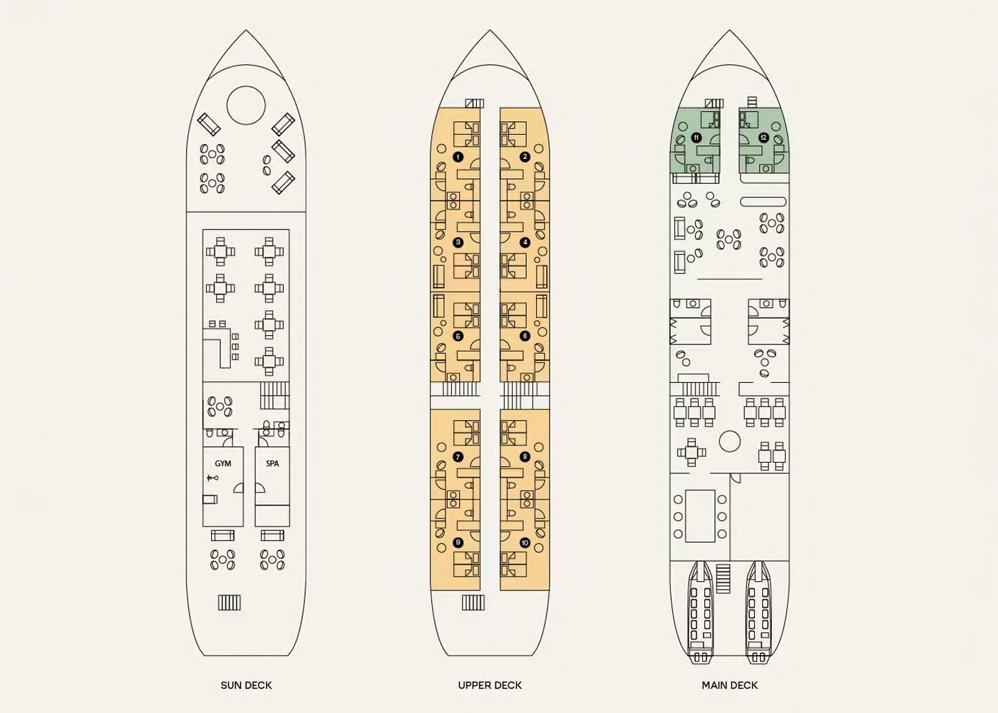 All are are fully air-conditioned and have a minibar and tablets, along with a private bathroom with shower, amenities and hairdryer. Four of the double suites can be connected, creating two sets of interconnecting suites, ideal for families with children. One of the cabins in each pair of interconnecting doubles can also be set up to feature an additional sofabed should triple occupancy be required (children only), so theoretically you could have two dual-suite setups catering to 5 passengers in each, but it is important to note that two other double suites on board can be setup up with triple occupancy, and there is a maximum of two triple occupancy cabins permitted per departure.